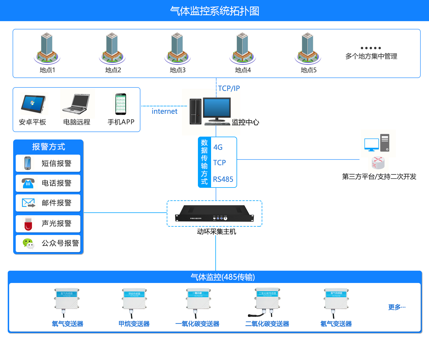 一氧化碳CO氣體監控系統將會探測到CO氣體濃度傳輸到系統上,一旦CO濃度達到設備上限報警值,監控系統就會發出聲光、短信、電話、APP等報警,第一時間聯系告知相關人員,并輸出上限報警信號以啟動排風扇等有效的措施,降低現場的CO氣體濃度。