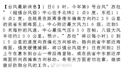 截至1日09時,“蘇拉”(超強臺風級)中心位于距離廣州市東南方向約315公里的南海東北部海面上,也就是北緯21.9度、東經116.2度,中心附近最大風力16級(55米/秒),中心最低氣壓930百帕。