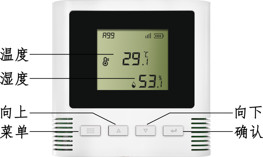 1. 主顯示界面為:溫度及濕度當前值、SIM信號強度、電池電量信息。