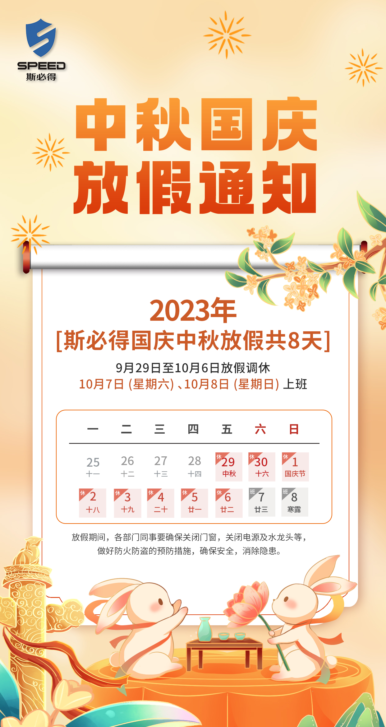 根據國務院辦公廳通知精神,現將2023年中秋節、國慶節放假安排通知如下:2023年9月29日(星期五)至10月6日(星期五)放假調休,共8天。10月7日(星期六)、10月8日(星期日)上班。