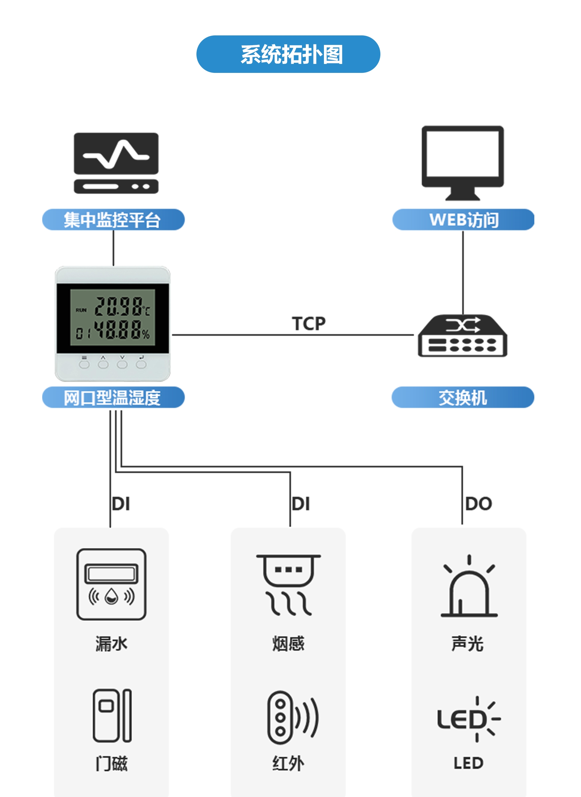 SPD-TH-RJ45網絡型溫濕度控制器可以用于實現多點監測、混合組網、和上位機系統通訊,該產品廣泛應用于工業現場、養殖場、種植場、辦公室、超市、檔案室、生產車間、倉庫、機房、自動控制、醫療等要求溫濕度測量的場合,其高穩定性、適用性以及高性價比是產品首選,且可匹配煙感、水浸、供配電等傳感器,接入動力環控監控系統中,實現更智能化的管理。