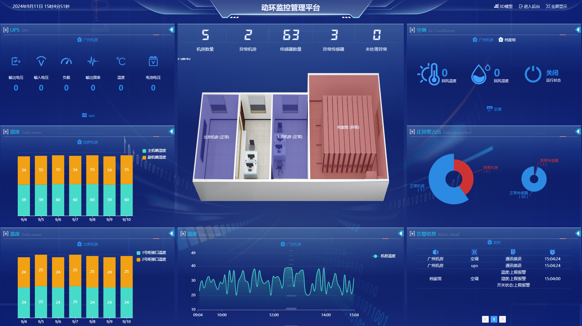 5、環境系統: 精密空調、泄漏、溫度、濕度、新風機、氣體、塵埃;精密空調:監測回風溫度/濕度等參數,壓縮機、風機、加濕器、去濕器等部件的狀態,控制空調的啟停,調節溫度和濕度。普通空調:通過對其控制電路的分析,可實現對普通空調的狀態監測和啟??刂啤P嘛L機:新風機工作狀態監測以及啟??刂?。溫濕度:監測各房間溫濕度傳感器所采集的溫度和濕度數據,并越限報警。