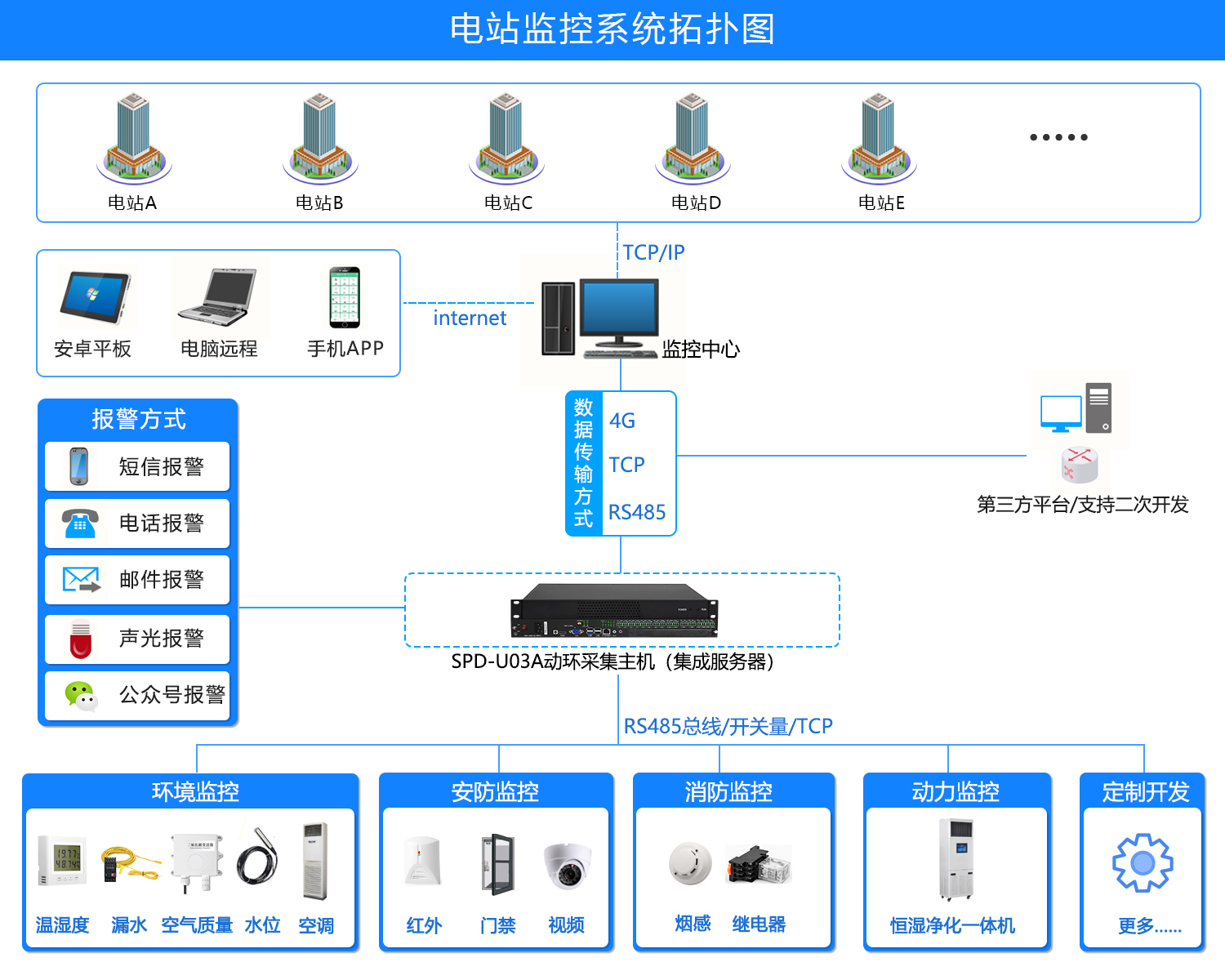 所要求的的解決方案應(yīng)接入電站的動(dòng)力環(huán)境監(jiān)測(cè)系統(tǒng),電腦軟件監(jiān)控,選配APP、電話、微信、小程序、現(xiàn)場(chǎng)聲光、短信語(yǔ)音等告警方式。在多個(gè)分布在不同需要檢測(cè)漏水的區(qū)域中,可通過(guò) 485 布線的方式連接至動(dòng)力環(huán)境監(jiān)控主機(jī),將數(shù)據(jù)傳輸至環(huán)境監(jiān)控平臺(tái),在監(jiān)控的區(qū)域內(nèi)出現(xiàn)漏水狀況,系統(tǒng)會(huì)將漏水的信息通過(guò)所選定的告警方式來(lái)通知管理人員,以便管理人員及時(shí)作出處理,從而避免一些意外事故的出現(xiàn)。