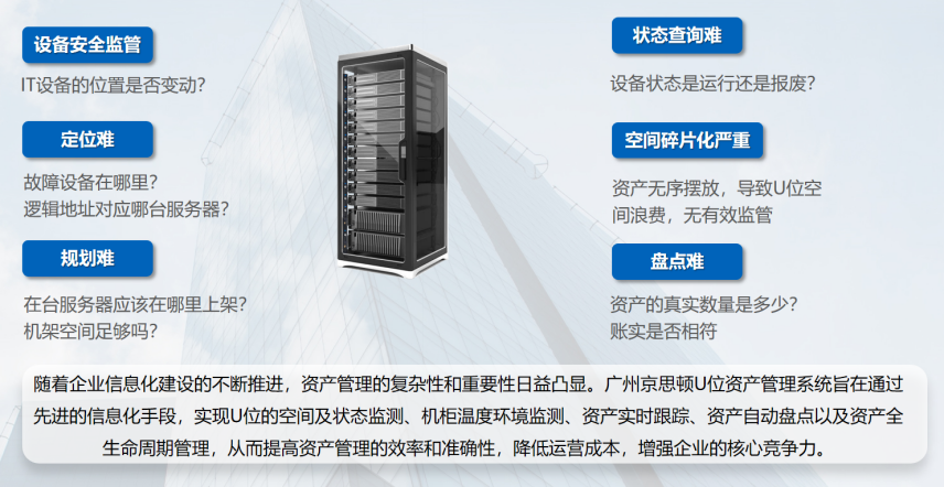 廣州斯必得U位資產(chǎn)管理系統(tǒng)通過先進(jìn)的技術(shù)手段和管理理念,實現(xiàn)了對U位空間和狀態(tài)、機(jī)柜溫度環(huán)境、資產(chǎn)實時跟蹤、自動盤點以及全生命周期的全面管理。該系統(tǒng)的實施將有效提升企業(yè)的資產(chǎn)管理水平,降低運營成本,增強(qiáng)企業(yè)的競爭力。